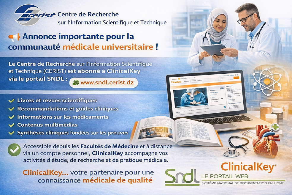 Le Centre de Recherche sur l’Information Scientifique et Technique (CERIST) vous informe qu’il est abonné à la base de données ClinicalKey, accessible via le portail du Système National de Documentation en Ligne (SNDL)